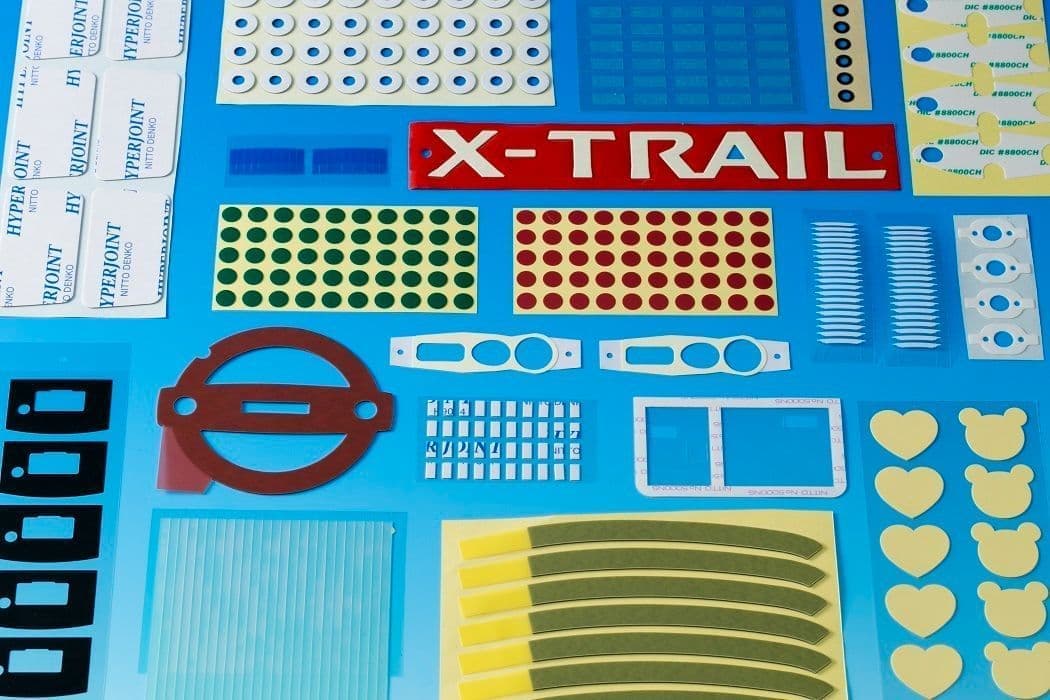 当社の強みは基材(ポロン・ナンネックス・スポンジ・カプトン・ノーメックス・サンモルフィーV)と両面テープ(日東電工・DIC・寺岡製作所・恵比寿化成…)を最初からたくさんの種類在庫していること。それに加え機械のバリエーションが多種多様でテーブル移動式自動打抜き機・ロール送り式高速自動打抜き機を主軸にそれぞれの前処理・後処理・検査工程を担う機器を複数設備しております。なので瞬時にいろいろな機械組み合わせを提案しお客様の様々な課題解決をしていくことができます。
