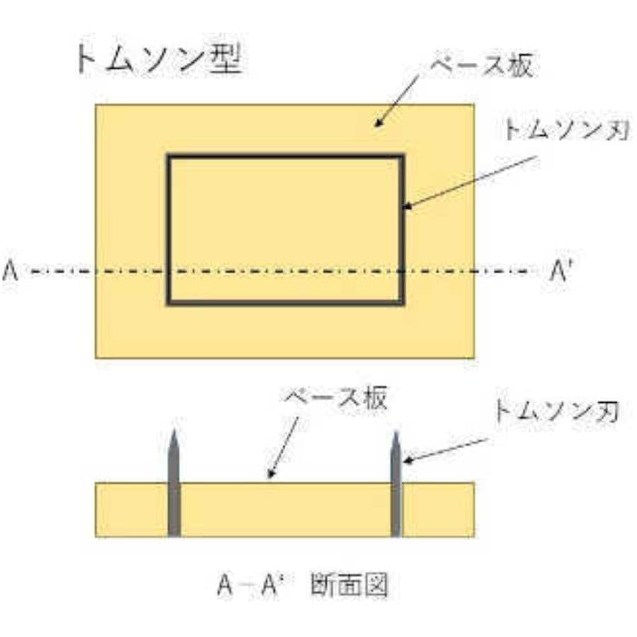 トムソン加工とは、トムソン型を用いた打抜き加工のことですトムソン型とは、上の写真のようにベースの木の板に溝を掘り、溝の部分に刃を入れた型のことをいいます近年では、レーザービーム加工機や自動刃曲げ機をCADにより制御することが可能になり、これまでよりも高精度の型の作成が可能になりました(下記のトムソン型の作成工程を参照下さい。)また、プレス金型に比べてコストが低く、製作日数も短いため、打抜き加工の分野では、試作~量産まで幅広く使用されています。