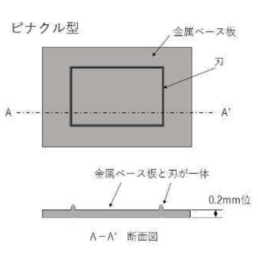 ピナクル型とは、ピナクルは塚谷刃物の腐食刃の商標です。他社メーカーでは違う呼び方となります。腐食刃は金属板に刃として残す部分にマーキングを施し、マーキングをしていない部分を先に腐食させて取り除き、残った凸部分に最後に刃付けをしてできあがります。トムソン型と比較して、金属ベース及び機械加工により抜群の高精度であることと、トムソン刃は一本の刃を曲げて作るために刃のつなぎ目ができ、抜き断面にどうしても段差ができるのに対して、ピナクル型は、刃のつなぎ目なしで抜き断面の段差なしの製品ができます。 欠点は、トムソン型より高価(数倍)であることと納期がかかること、一部の刃の欠けでも全面作り替えになること、なによりも薄いものしか加工できないことがあります。